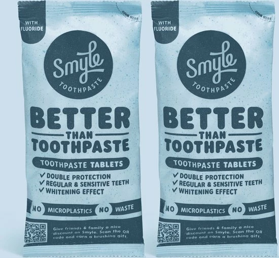 Je kauwt een tabletje fijn en poetst met je natte tandenborstel, twee maal daags gedurende twee minuten. Zoals je dat al je hele leven doet, dat klopt Spoel goed na en Smyle!