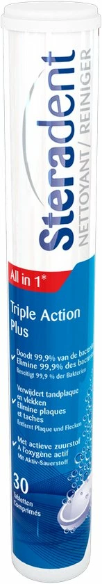 De formule activeert duizenden microbellen die ervoor zorgen dat de actieve zuurstof alle delen van de gebitsprothese bereikt. Zorgt voor een diepgaande reiniging daar waar de tandenborstel niet bij kan en verwijdert 50% meer tanplaque dan een traditionele peutsbeurt. Geschikt voor volledige en gedeeltelijke protheses. Bij gebruik tweemaal per dag zorgt Steradent Triple Action Plus voor een perfect schone prothese.