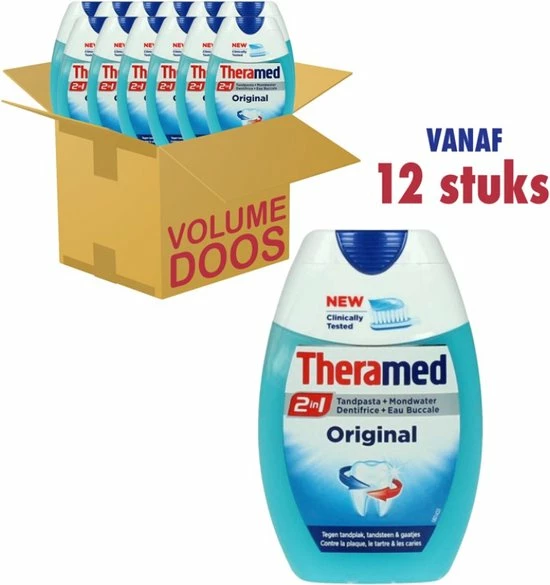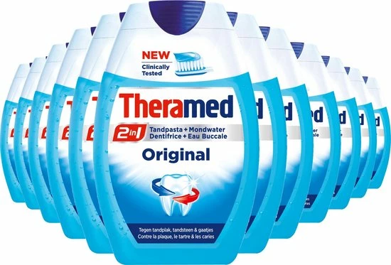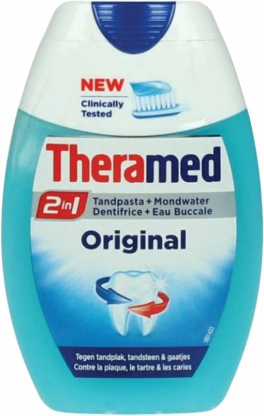 De 2in1 formule van Theramed Original beschermt de tanden tegen cari?s, tandvleesontsteking, tandplak en tandsteenvorming. Zijn frisse smaak zorgt voor een langdurige frisse adem.