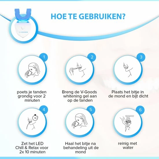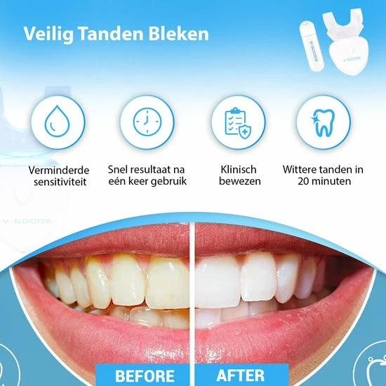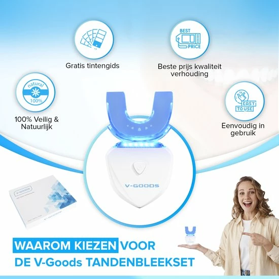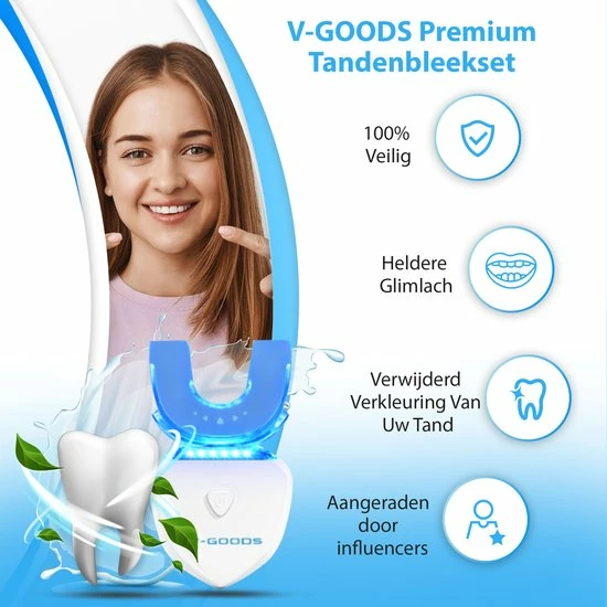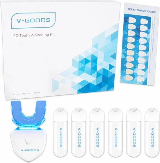Ook altijd al onzeker geweest over de kleur van jouw tanden?! Dan is de V-Goods Premium tandenbleekset met maarliefst 6 whitening capsules de perfecte oplossing voor een stralend gezond wit gebit. Wij geven 100% tevredenheidsgarantie, check hieronder waarom deze premium tandenbleekset ideaal is voor jou!