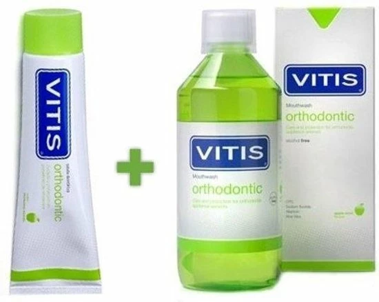 Vitis Orthodontic Pakket bevat het mondspoelmiddel en tandpasta van vitis orthodontic