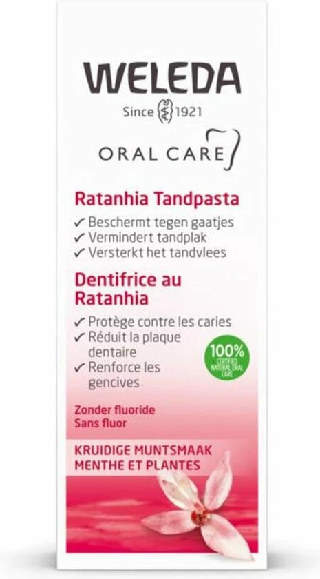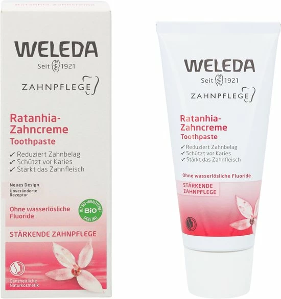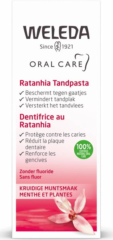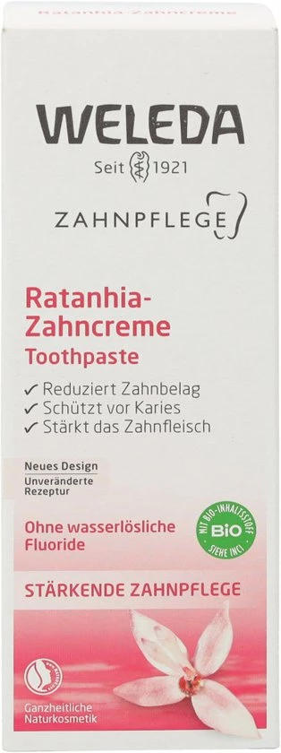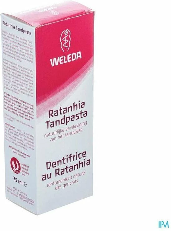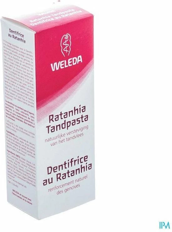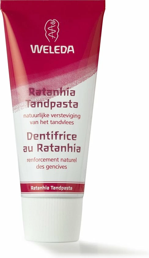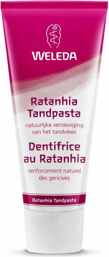 Ratanhia Tandpasta maakt het tandvlees sterk en stevig en trekt het samen rond de tandwortel. Bij goed poetsen met Ratanhia Tandpasta krijgt tandplak geen kans. Als het tandvlees rood en gevoelig is, werken Ratanhia en mirre zuiverend. Aan de tandpasta zijn geen fluoride en synthetische schuimmiddelen toegevoegd. Let op: Dit product bevat pepermuntolie. Om deze reden raden wij af om dit product te gebruiken in combinatie met homeopathische middelen.