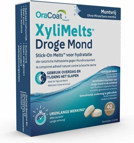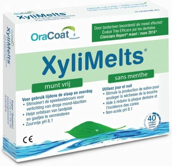 Xylimelts munt vrij zijn plakkende tabletten met Xylitol en cellulose. Deze bestanddelen lossen langzaam op in de mond en stimuleren de aanmaak van speeksel. De tablet geeft daardoor urenlang een vochtige, kalmerende en stimulerende speekselvloed. Daardoor blijft de mond vochtig.