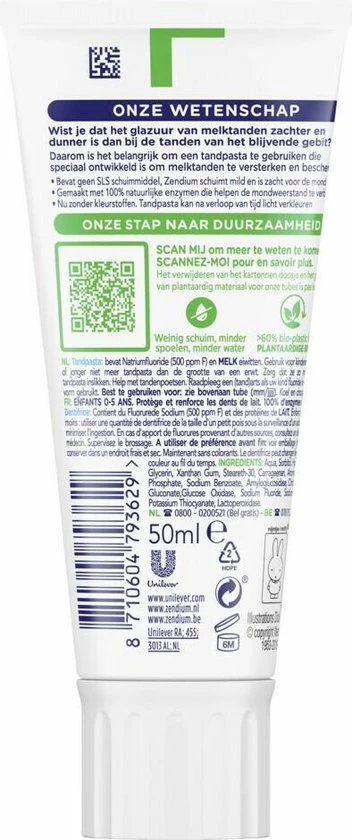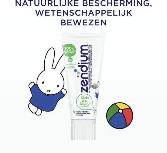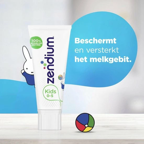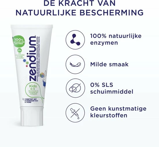 Zendium Kids Tandpasta. Natuurlijke bescherming, wetenschappelijk bewezen. Zendium?s milde tandpasta bevat bevat 100% natuurlijke enzymen die de goede bacteri?n in de mond bevorderen en daarmee de mond op natuurlijke wijze beschermt. Voor een sterk melkgebit, gezond tandvlees en een frisse adem. Het is belangrijk om het gebit van je kind goed schoon te houden. Door goed de tanden te poetsen houd je het gebit gezond. Daarnaast geeft het een schoon en fris gevoel. Wist je dat het glazuur van melktanden zachter en dunner is dan bij de tanden van het blijvende gebit? Daarom is het belangrijk om een tandpasta te gebruiken die speciaal ontwikkeld is om melktanden te versterken en beschermen. De Zendium Kids 0-5 jaar tandpasta is speciaal ontwikkeld voor kinderen van nul tot vijf jaar. De unieke formule helpt de melktanden van je kind te beschermen. Daarnaast bevat de tandpasta fluoride. Dit versterkt het glazuur en helpt gaatjes voorkomen. Versterk de mondweerstand van je kind door te poetsen met de Zendium tandpasta speciaal voor kinderen. Zendium tandpasta schuimt mild en is zacht voor de mond. Zendium tandpasta kids is nu zonder kleurstoffen. De kindertandpasta kan hierdoor na verloop van tijd licht verkleuren. Gebruik voor kinderen jonger dan 6 jaar een hoeveelheid tandpasta ter grootte van een erwt.